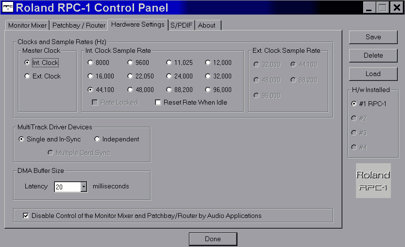 HOWEVER I have found that it is better to start up the computer FIRST andthen to power up the VM-3100 NEXT. Also hitting SHIFT/F1 for me helps torestore LOGIC configuration. I'm not sure whether you should use F1 , F2, ORF3 with N-TRACKS. DIGITAL I/O CLOCK RATES also NEED TO BE SYNCRONIZED. AlsoCLICK the CONTROL PANEL Roland RPC-1 H/W ICON. Set to I N T E R N A LCLOCK/ SAMPLE RATE 44.1 KHZ I have recorded/PLAYEDBACK 96 khz with COOLEDIT but things seem to work much better if you set up at 44.1.